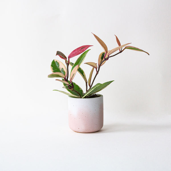 This unique pot fades from white to blush at the bottom, giving each piece a unique dip dying effect. It has been cast from a cement and marble stone to create a high quality stone finish with sparkle. The plant pot has been lovingly hand cast, sanded and sealed. Then finished with cork to protect the product and your surfaces.